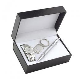 SET DE REGALO CON: RELOJ DE PULSO METALICO, LLAVERO CUADRADO Y PLUMA METALICA CON ORIFICIOS, INCLUYE CAJA DE LUJO