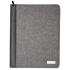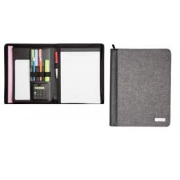 CARPETA: 53,5 x 33,5 x 2,5 cm. Simil Cuero y Lino 150D. Carpeta con cierre. Exterior acojinado. Placa metálica para grabado (Medida: 5x2 cm). Interior: Compartimento porta tablet, tarjetero, calculadora y 3 porta bolígrafos elásticos. Incluye block Tamaño A-4,rayado con 20 hojas
