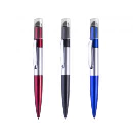 con juego de luces, que encienden con un click, cuerpo de plástico y clip metálico, además cuenta con punta suave para pantallas touch