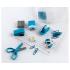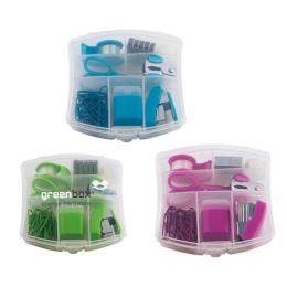 Incluye clips para papel, sacapuntas, mini engrapadora, grapas, saca grapas, tijeras, mini despachador de cinta adhesiva y cinta de repuesto. Presentación: estuche de plástico transparente.