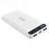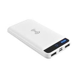Batería auxiliar para smartphone con linterna LED y función de carga inalámbrica. Capacidad 8,000 mAh. Cuenta con 2 salidas USB, entrada micro USB y tipo C. Incluye cable cargador compatible con USB y micro USB.