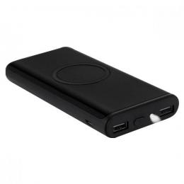 Batería auxiliar para smartphone con linterna LED y función de carga inalámbrica. Capacidad 8,000 mAh. Cuenta con 2 salidas USB, entrada micro USB y tipo C. Display para mostrar el nivel de batería. Incluye cable cargador compatible con USB y micro USB.