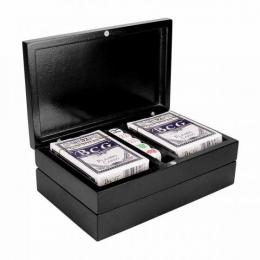 Incluye estuche de madera con 5 dados, 2 barajas plastificadas y dominó de 28 piezas